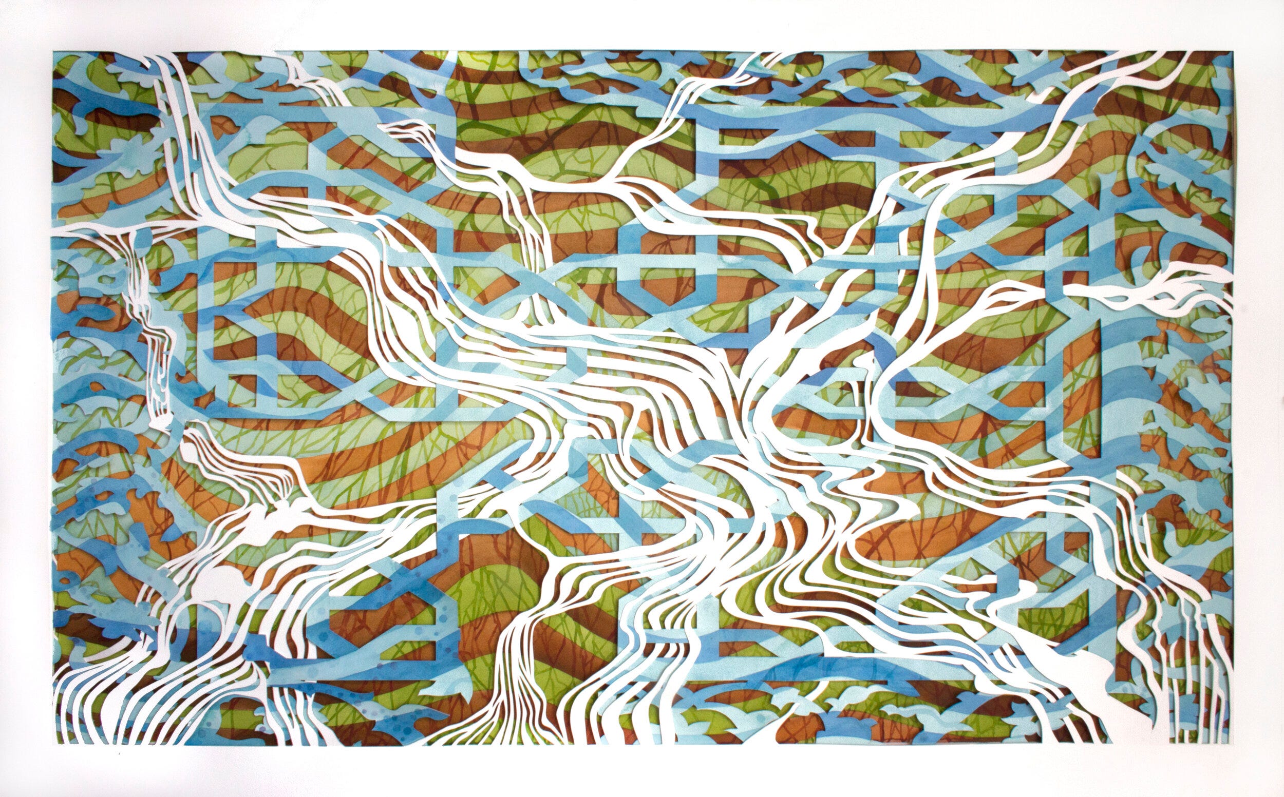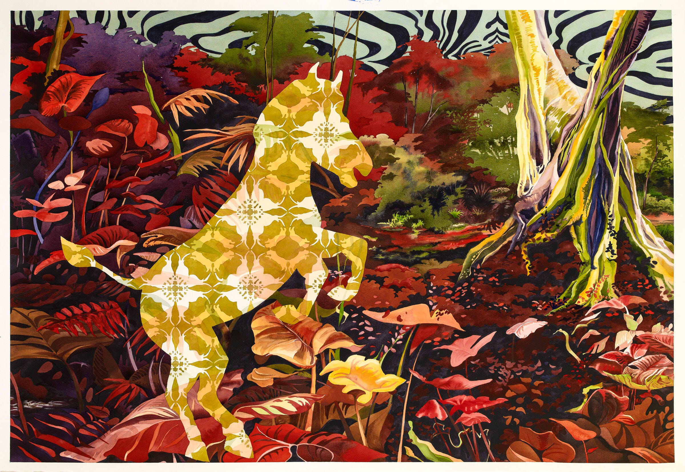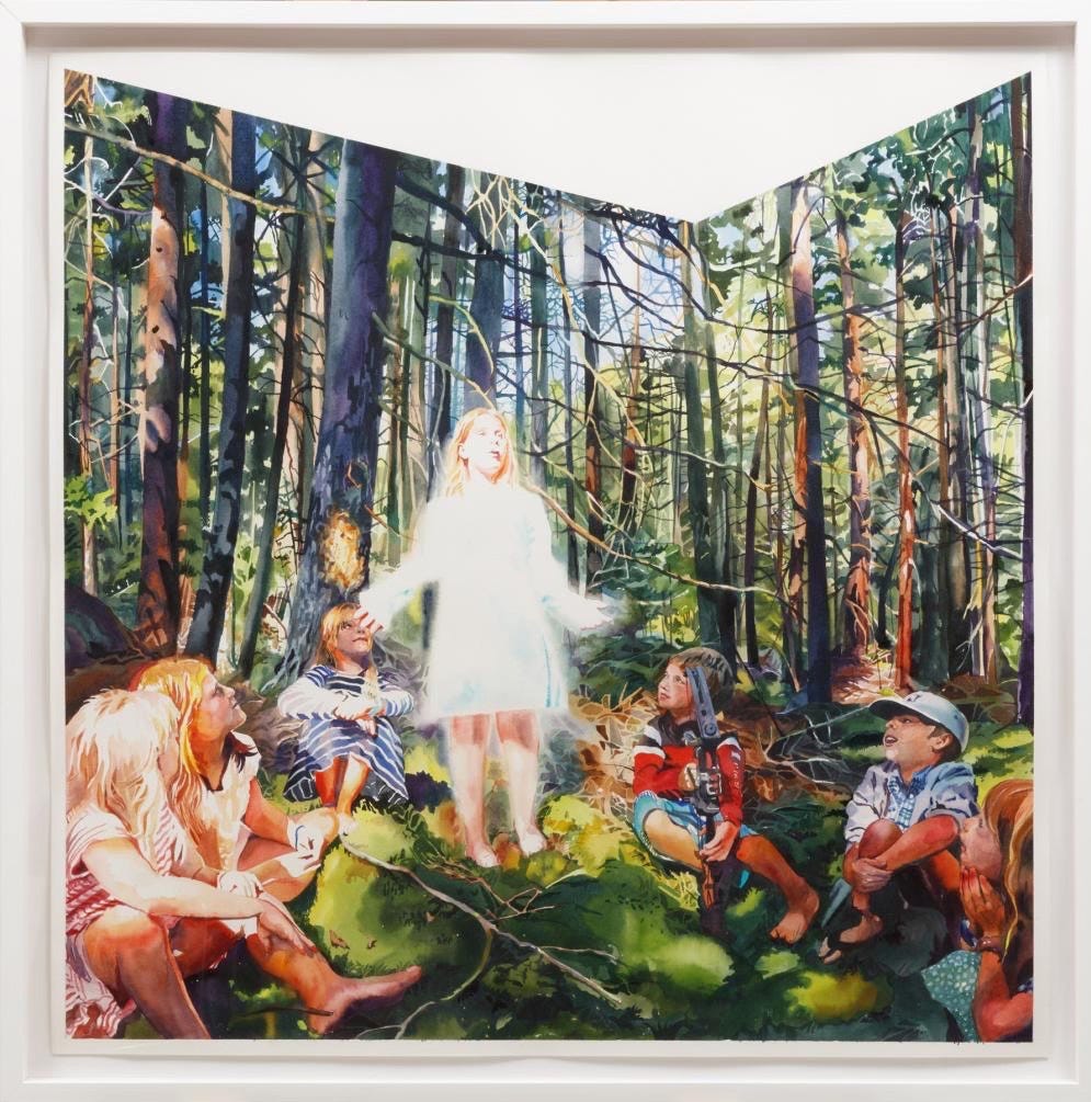 …Reminiscent of his 2012 series of watercolors “The Savage State” in which he reinterprets Thomas Cole’s “The Course of Empire” (1833-1836), illustrating the forest floor and the trees overhead through fractured geometry. This depiction of the angelic child as “the prophet” with the group of children listening intently remarks upon the reality that the next generation must confront what the previous one has overlooked, especially when considering humans’ relationship with the earth.